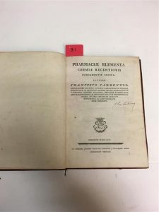 31. CARBONELL Y BRAVO (Francesc) : Pharmaciae elementa chemiae recentioris fundamentis innixa. Barcelone, Francesc Piferrer, 1796, in-4, basane fauve racinée de l'époque, dos lisse cloisonné et fleuronné, pièce de titre, encadrement de tortillon doré sur les plats, tranches rouges, [2] ff. n. ch. (titre, dédicace), XII pp., 125 pp., [3] pp. n. ch. (table, errata).