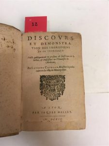 32. CATELAN (Laurent) : Discours et démonstration des ingrédiens de la thériaque : faicte publiquement en présence de Messieurs de la iustice, & professeurs de l'Université de médecine. Lyon, Jacques Mallet, 1614, in-8, vélin souple de l'époque, [4] ff. n. ch., [331] pp., mal chiffrées 313 (il y a saut de chiffrage de 320 à 303), [4] pp. n. ch. (table).