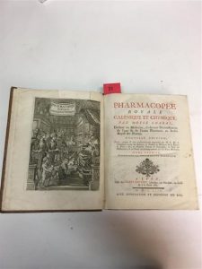 33. CHARAS (Moïse) : Pharmacopée royale galénique et chymique (). Nouvelle édition, revue, corrigée & très-considérablement augmentée par M. L. M. [Le Monnier] () ; avec les formules latines & françoises ; le tarif des médicamens, & un traité extrêmement curieux sur les eaux minérales. Lyon, frères Bruyset, 1753, deux tomes en un fort vol. in-4, basane fauve marbrée de l'époque, dos à nerfs orné de filets dorés, pièce de titre, tranches rouges, xvj pp., 440 pp., viij pp., pp. 441-876, un f. vierge, 72 pp., un frontispice allégorique et 6 planches dépliantes hors texte, le tout gravé sur cuivre.
