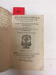45. DU CHESNE (Joseph) : Pharmacopoea dogmaticorum restituta. Pretiosis selectisque Hermeticorum floribus abunde illustrata. Secunda editio () aucta & correcta. Paris, Claude Morel, 1607, in-8, vélin souple de l'époque, dos lisse, tranches dorées, [4] ff. n. ch. (titre, dédicace, préface), 619 pp., [13] ff. n. ch. (table et privilège).