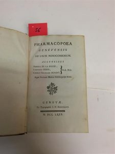 ad usum nosocomiorum. Auctoribus Daniele de La Roche, Ludovico Odier, Carolo-Gulielmo Dunant (). Genève, J.-P. Bonnant, 1780, in-8, demi-basane brune, dos lisse orné de fleurons et semis d'ondulés dorés, pièce de titre brique, xij pp., 199 pp., [18] pp. n. ch. (table et errata). Unique édition.