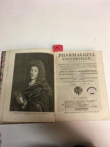 On joint l'édition de 1763 : Pharmacopée universelle (). Paris, Desaint & Saillant, Jean-Thomas Hérissant, 1763, 2 vol. in-4, veau fauve marbré de l'époque, dos à nerfs cloisonnés et fleuronnés, pièces de titre et de tomaison, encadrement de triple filet à froid sur les plats, tranches rouges, [2] ff. n. ch., xvj pp., [1385] pp. mal chiffrées 1285 en numérotation continue (le chiffrage rétrograde de 1100 à 1001), avec un beau portrait-frontispice gravé par N. Pitau ; il y a deux ff. différents chiffrés 657-58, et les pp. 705-708 n'existent pas. De la bibliothèque de Du Mans de Bourglévêque (1773-1837, ex-libris héraldique gravé par Andouard). Bel exemplaire. Ensemble 3 volumes.