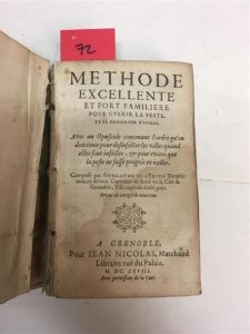 72. LERISSE (Guillaume de) : Méthode excellente et fort familière pour guérir la peste, et se préserver d'icelle. Avec un opuscule contenant l'ordre qu'on doit tenir pour désinfecter les villes quand elles sont infectes, & pour éviter que la peste ne fasse progrès en icelles. Reveu & corrigé de nouveau. Grenoble, Jean Nicolas, 1628, in-8, vélin souple de l'époque, dos lisse, [4] ff. n. ch., 3 pp., [7] ff. n. ch., 76 pp., [3] ff. n. ch. Sallander 5732. Guillaume de Lérisse était capitaine de santé de la ville de Grenoble. Relié avec 5 opuscules rares sur la peste : 1. VEGE (Pierre de) : Traicté de la précaution et guérison asseurée de la peste. Grenoble, Jean Nicolas, s.d., 45 pp., un f. vierge. Aucun exemplaire au CCF. Au Worldcat, exemplaires seulement à la Wellcome library, à Chicago, et University of Wyoming. Rarissime