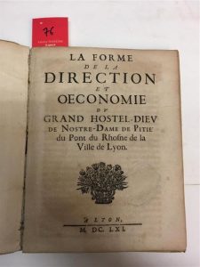 76. [LYON]. La Forme de la direction et oeconomie du Grand Hostel-Dieu de Nostre-Dame de Pitié du pont du Rhosne de la ville de Lyon. Lyon, 1661, in-4, vélin souple de l'époque, dos à nerfs, encadrement de double filet doré sur les plats, tranches dorées, [5] ff. n. ch. (titre, dédicaces, table des chapitres), 116 pp., manque la planche, qui a dû être détachée comme assez souvent. La première édition de ce règlement date de 1646.