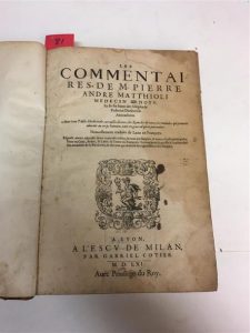81. MATTIOLI (Pierandrea) : Les Commentaires () sur les six livres des simples de Pedacius Dioscoride Anazarbéen. Avec une table médicinale extraicte d'iceux, des remèdes de toutes les maladies qui peuvent advenir au corps humain, tant en général qu'en particulier. Nouvellement traduits du Latin an Françoys. Esquelz nous avons adiousté deux copieuses tables, de tous les simples, & autres choses principales : l'une en Grec, Arabe, & Latin : & l'autre en Françoys. Le tout pour le proffit & commodité des amateurs de la médecine, & de ceux qui désirent la cognoissance des simples. Lyon, Gabriel Cotier, 1561, in-folio, demi-basane brune à coins postérieure, dos dos lisse orné de croisillons et hachurés à froid, guirlande à froid sur les plats, tranches jaunes, [31] (sur 32) ff. n. ch., 538 pp., [2] ff. manuscrits, [4] ff. n. ch. d'index (les derniers feuillets, manquant, ont été remplacés par deux feuillets manusctrits