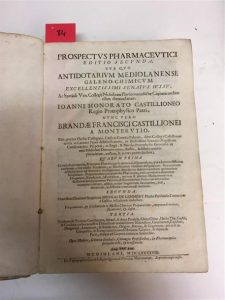 , sub quo Antidotarium Mediolanense galenochimicum excellentissimi Senatus iussu (). Milan, Carlo Giuseppe Quinto, 1698, 3 parties en un fort vol. in-folio, vélin souple de l'époque, dos lisse, étiquette de titre postérieure, [22] ff. n. ch. (titre, dédicace, préface, poésies liminaires, tables), 483 pp., [17] ff. n. ch. (titre de relais, dédicace, explication de la planche, préface, tables), 216 pp., un f. vierge, titre de relais, pp. 5-119, avec une planche hors texte dans la deuxième partie. Ferguson II, 228-229 (notre édition). Duveen, 486-487 (pour l'édition de 1729). Si le titre est en latin, ainsi que quelques pièces liminaires, le texte est entièrement rédigé en italien. La deuxième partie forme une traduction italienne du traité de chimie de Lémery ; la troisième aborde quantité de substances servant de matière pharmaceutique (dont thé, café, cholcolat, sucre, etc.). Exemplaire déboîté.