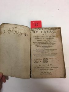 , panacée, pétun : autrement herbe à la reyne, avec sa préparation & son usage, pour la plus part des indispositions du corps humain, ensemble les diverses façons de le falsifier, & les marques pour le recognoistre : composé premièrement en Latin par Iean Neander (), & mis de nouveau en François par I. V. [Jacques Veyras] (). Lyon, Barthélémy Vincent, 1630, petit in-8, vélin souple de l'époque défraîchi, [4] ff. n. ch. (titre, dédicace, préface), 342 pp., avec 9 planches hors texte (le privilège au verso de la dernière). Bragge, Bibliotheca Nicotiana, 26 (pour l'édition de 1626). Reprise à l'identique de l'édition de 1626 chez le même libraire. Il s'agit de la première traduction française de la Tabacologia (1622, Elzévir), un des premiers ouvrages sur l'usage médical du tabac. Ex-libris manuscrit Reynard. Mouillures claires assez abondantes.
