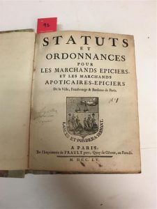 92. [PARIS]. Statuts et ordonnances pour les marchands épiciers, et les marchands apoticaires-épiciers de la ville, fauxbourgs & banlieue de Paris. Paris, Prault père, 1755, in-4, demi-vélin rigide du XIXe siècle, dos lisse, 87 pp. La première édition de ces statuts remonte à 1639.
