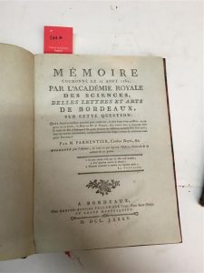 100. PARMENTIER (Antoine-Augustin) : Mémoire couronné le 25 août 1784, par l'Académie royale des sciences, belles lettres et arts de Bordeaux, sur cette question : Quel seroit le meilleur procédé pour conserver, le plus long-temps possible, ou en grain ou en farine, le maïs ou blé de Turquie, plus connu dans la Guienne sous le nom de blé d'Espagne ? Et quels seroient les différens moyens d'en tirer parti, dans les années abondantes, indépendamment des usages connus & ordinaires dans cette province ? Augmenté par l'auteur, de tout ce qui regarde l'histoire naturelle & la culture de ce grain. Bordeaux, Arnaud-Antoine Pallandre l'aîné, 1785, in-4, demi-chagrin cerise moderne, dos à nerfs fleuronné, couverture d'attente de papier bleu conservée,