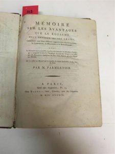 , considérés sous leurs différens rapports avec l'agriculture, le commerce, la meunerie et la boulangerie. Avec le mémoire sur la nouvelle manière de construire les moulins à farine, qui a remporté le prix de l'Académie royale des sciences en 1785, par M. Dransy () ; avec figures gravées d'après ses dessins. On y a joint un manuel sur la manière de traiter les grains, et d'en faire du pain. Paris, Barrois l'aîné, 1789, in-4, basane fauve marbrée de l'époque, dos à nerfs cloisonné et fleuronné, pièce de titre cerise, tranches mouchetées, [2] ff. n. ch., 447 pp., avec 10 planches dépliantes hors texte. Seconde édition : il s'agit de la reproduction exacte et sans aucune modification du mémoire que Parmentier avait publié en 1786 sur la province du Languedoc, dont Barrois n'a changé que le titre et le faux-titre. Relié à la suite, du même auteur : Avis aux habitans des villes et des campagnes de la province de Languedoc, sur la manière de traiter leurs grains, et d'en faire du pain (). Paris, Imprimerie des Etats du Languedoc, 1787, iv pp., pp. 5-52. Edition originale peu commune. Un mors fendu, coins abîmés.