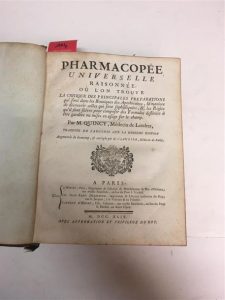 , où l'on trouve la critique des principales préparations qui sont dans les boutiques des apothicaires, la manière de découvrir celles qui sont sophistiquées, & les règles qu'il faut suivre pour composer des formules destinées à être gardées ou mises en usage sur le champ. Traduite de l'Anglois sur la onzième édition. Augmentée de beaucoup, & corrigée par M. Clausier (). Paris, D'Houry père, Charles-Jean-Baptiste Delespine, Laurent d'Houry, 1749, fort vol. in-4, basane fauve marbrée, dos à nerfs cloisonné et fleuronné, pièce de titre cerise, tranches rouges, [3] ff. n. ch., xviii pp., 490 pp., 516 pp., [30] ff. n. ch. (tables et privilège). Manquent les 3 planches hors texte. Sallander, 7714 (édition anglaise de 1739). Unique traduction française de la Pharmacopoeia officinalis & extemporanea (Londres, 1718, pour la première édition). Regroupe 2516 préparations. Exemplaire de François-Vincent Raspail (1794-1878), médecin et chimiste, acheté à la vente de sa bibliothèque.
