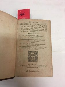 116. RANCHIN (François) : Oeuvres pharmaceutiques (...). Assavoir un Traicté général de pharmacie. Ensemble un docte commentaire sur les quatre Théorèmes & canons de Mesue. Avec deux excellens