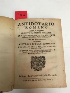117. [ROME]. Antidotario Romano Latino, e volgare. Tradotto da Ippolito Ceccarelli. Li ragionamenti, e le aggiunte dell'elettione de' semplici, e prattica delle compositioni (). Rome, héritiers de Mascardi, 1668, petit in-4, demi-vélin à coins du XIXe siècle, dos lisse orné de filets dorés, pièce de titre cerise, [8] ff. n. ch. (titre, table des préparations), pp. 5-353, 26 pp. [Supplément], texte sur deux colonnes (latin et traduction italienne en regard). Ferguson I, 36 (édition de 1635). Une des nombreuses éditions de cette importante pharmacopée publiée dès le XVIe siècle.