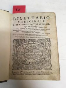 120. SANTINI (Giuseppe) : Ricettario medicinale (.), speciale al Corallo, utilissimo a medici et a speciali. Nel quale si descrivono i modi di comporre medicine, elettuarij, siroppi, pillole, trochisci, ogli, empiastri, cerotti, & altre cose necessarie per l'uso della specieria. Con un pieno trattato alla cognitione del provedere, eleggere, conservare, preparare, comporre ogni sorte di medicamento. Serravalle, Marco Claseri, 1604, in-8, cartonnage modeste du XIXe siècle, pièce de titre fauve, [10] ff. n. ch., 504 pp., 3 gravures sur bois dans le texte. Un seul exemplaire au CCF (Mazarine). Si l'on se refère à la notice déjà ancienne de Deschamps (col. 1170), il s'agirait là de la toute première impression de la petite ville de Serravalle (en Vénétie) : le