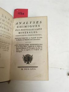 127. [THERMALISME. - BAYEN (Pierre) :] Analyses chimiques des nouvelles eaux minérales, vitrioliques, ferrugineuses, découvertes à Passy dans la maison de Madame de Calsabigi. Avec les proprietés medicinales de ces mêmes eaux, fondées sur les observations des médecins & chirurgiens des plus célébres, dont on rapporte les certificats authentiques. S.l. [Paris, veuve de Gabriel-François Quillau], 1757, in-12, veau fauve marbré, dos à nerfs cloisonné et fleuronné, pièce de titre, tranches marbrées, viij pp., 130 pp., [2] ff. n. ch. de table. Seulement 3 exemplaires au CCF (BnF, BIUM, Strasbourg). Unique édition, peu commune : le territoire de Passy regorgeait de sources, exploitées depuis longtemps pour leurs vertus thérapeutiques. Cette découverte nouvelle eut lieu en 1755.