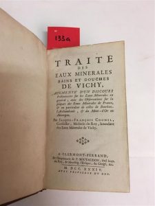 133. [THERMALISME]. CHOMEL (Jacques-François) : Traité des eaux minérales, bains et douches de Vichy, augmenté d'un discours préliminaire sur les eaux minérales en général ; avec des observations sur la plûpart des eaux minérales de France, &en particulier celles de Bourbon-l'Archambault, & du Mont-d'Or en Auvergne. Clermont-Ferrand, Imprimerie de P. Boutaudon, 1734 [= 1737], veau brun de l'époque, dos à nerfs cloisonné et fleuronné, encadrement de simple filet à froid sur les plats, tranches mouchetées de rouge, [4] ff. n. ch. (titre, préface), cix pp., [11] pp. n. ch. (table des matières, f. vierge), 348 pp., [2] ff. n. ch. de privilège (daté de 1737). Édition originale (l'ouvrage fut réédité en 1738, et cette dernière édition est la seule à comporter des planches), comportant une importante description de Vichy au début du XVIIIe siècle. Jacques-François Chomel (1678-1756), frère du botaniste et médecin Pierre-Jean-Baptiste Chomel, était alors intendant des eaux de Vichy, depuis 1715. On lui doit d'important travaux d'agrandissement du premier établissement thermal et le réaménagement des bains. Coiffe supérieure rognée.