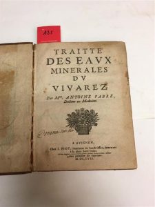 Unique édition de ce traité qui porte essentiellement sur les eaux de Vals-les-Bains (près d'Aubenas), exploitées depuis 1602. Reliure très frottée.