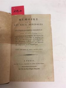 utiliser ces eaux salutaires à la guérison des blessures des défenseurs de la République (). Paris, R. Vatar, an III [1795], in-8, basane fauve marbrée de l'époque, dos lisse orné de volutes dorées, pièce de titre, tranches rouges, xxvi pp., 154 pp., un f. vierge, et 4 planches dépliantes hors texte, dont deux plans, petite déchirure f. 13-14. Perret, 2679. Labarère, 937. Seconde édition (la première de l'an II), aussi rare que l'originale. Texte en fait rédigé de conserve par l'ingénieur des Ponts et Chaussées Lomet (1759-1826, alors capitaine à l'Armée des Pyrénées) et Ramond de Carbonnières ; mais seule la première édition le signale. Concerne Barèges, Cauterets, Bagnères-sur-Adour.