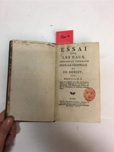 On joint : BRESMAL (Jean-François) : Hidro-analise des minérales chaudes & froides de la ville impériale d'Aix la Chapelle. Divisé en deux parties. Aix-la-Chapelle, Barchon, 1741, petit in-8, basane fauve marbrée, dos à nerfs cloisonné et fleuronné, pièce de titre, tranches rouges, xvj pp., 176 pp. en pagination continue, [3] pp. n. ch. de table, avec 4 planches hors texte (dont 3 héraldiques, et une dépliante représentant les bains). Seulement deux notices au CCF (BnF et Strasbourg, pour les éditions de 1703 et 1728). La première édition était parue en 1703. Rare quelle que soit la sortie. Ensemble 2 volumes.