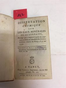 [THERMALISME]. NICOLAS (Pierre-François) : Dissertation chymique sur les eaux minérales de la Lorraine (). Nancy, Thomas, 1778,
