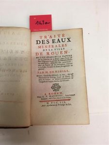 143. [THERMALISME]. NIHELL (James) : Traité des eaux minérales de la ville de Rouen, où l'on établit la nature & les principes de ces eaux, leurs vertus & leur usage pour la guérison des maladies simples & compliquées, auxquelles elles conviennent ; avec un régime & des précautions relatives à la boisson de toutes les eaux ferrugineuses en général. Rouen, E.-V. Machuel, 1759, in-12, veau fauve marbré de l'époque, dos à nerfs cloisonné et fleuronné, tranches rouges, [6] ff. n. ch. (faux-titre & titre, dédicace), xxxviij pp., 189 pp. Frère II, 339. Unique édition de cet opuscule qui traite essentiellement des eaux de la Marequerie ou de Martainville. Chirugien britannique, James Nihell ou Nichell (1708-1759) exerça aussi sur le continent. Un mors inférieur féndu.