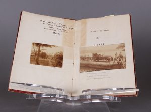 Album reprenant le texte du Guide routier du Kasai établi par l’Administration du District du Kasai (imprimé par l’A.P.C.N à Luebo, 34 p.), monté sur onglet et agrémenté de 25 photographies légendées, 2 photographies imprimées, et de 15 cartes dessinées à la main. Envoi manuscrit au prince. Sujets des photographies : chefs coutumiers (Lukengo, chef des Bakuba; chef Busbongo), population, sites, moyens de locomotion (bac à traille, passage d’eau, automobile sur pirogue, sur bac,…) , pont de lianes sur la Luebo, hérauts de Lukengo, cercueil et hutte banguli, mariage de «civilisés», etc.