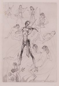 Burin, 33 x 22,5. Epreuve sur Japon, marges. Titrée, signée et justifiée «Jos. Bonvoisin. 22 / 60» au crayon en dessous. Très fraîche. Sous verre et passe-partout, cadre argenté. Il s’agit d’un hommage au musicien et compositeur liégeois Jean Rogister.