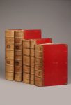 demi-basane blonde à coins du XIXe s., dos à nerfs ornés (qq. frottements ; rares mouillures marginales). Lors de ses études à Paris, Raoul Adrien eut Jean Dorat pour maître de poésie et Jean Passerat pour régent de littérature, et côtoyait régulièrement Ronsard. Il alla ensuite à Bourges étudier le droit civil et le droit canon sous Cujas. Particulièrement apprécié de ses pairs dans le domaine du droit, il aurait apporté ses lumières aux plus grands jurisconsultes de son temps : Pithou, Loysel, et Dupuy. Hormis une plaquette d'une trentaine de pages (L'Hymne d'Arion à Monseigneur le Dauphin, par le Sr d'Arion), il semble qu'aucune de ses oeuvres n'ait été publiée de son vivant, et ni même de manière posthume. L'ensemble proposé ici serait donc entièrement inédit, et majoritairement autographe. Il réunit : - Mémoire sur la Coutume du Bailliage de Senlis..., 1590. 2 vol. - Sur le droit canon, 1592. 1 vol. - Sur les origines des lois, etc. 1595. 1 vol. - Copie manuscrite des Traités précédents d'après l'original. 1 vol. (Description détaillée sur demande). Etiquettes ex-libris du XIXe siècle : de Glos la Balme, surmonté d'une couronne comtale ; monogramme BD Niviller surmonté d'un tortil de baron.
