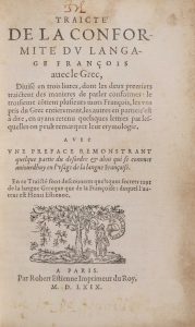 [Livre du XVIe siècle]. ESTIENNE (Henri). Traicté de la conformité du langage françois avec le grec, divisé en trois livres Avec une préface remonstrant quelque partie du désordre & abus qui se commet aujourdhuy en l'usage de la langue...