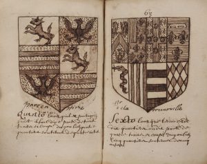 [Manuscrit]. [Héraldique]. Traité De Blason Contenant la manière aisée de faire des armoiries sans couleurs donné par le Tres Reverend pere Labbe Jesuite lan de grâce mil six centz soixante et dixsept. XVIIe siècle. Env. 11,5 × 8 cm., [119]...