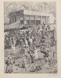 Eau-forte, 23,5 x 18. Epreuve sur Japon 28,5 x 23. Signée «Jean Dols» au crayon en-dessous à droite. En très belle condition. 2 exemplaires. Sujet : une foule d’artistes essaient d’entrer dans un musée des beaux-arts.