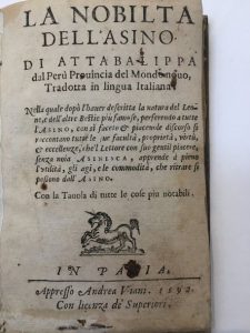 Curieux opuscule sur la noblesse et excellence de l'âne, dû à Adriano Banchieri (1568-1634), organiste, compositeur et poète bolonais connu sous le pseudonyme d'Atahualpa, le dernier empereur inca.