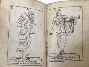Édition originale de ce traité, comprenant un titre gravé, 6 pages de texte gravées, et 20 jolies figures gravées en taille-douce représentant dans différentes attitudes, avec leurs proportions, quatre célèbres sculptures antiques: l'Hercule Farnèse, la Vénus de Médicis, le Méléagre et l'Appolon du Belvédère.