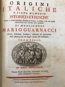 Mario Guarnacci (1701-1785), prélat et érudit italien né à Volterra, ancienne cité étrusque, fut l'une des principales figures de l'étruscomanie au siècle des Lumières: il s'occupa avec ardeur de revendiquer en faveur des anciens habitants de sa patrie, les Étrusques, une grande part dans la formation de la nation italique. L'ouvrage dans lequel il exprima ses idées sur ce sujet, fut critiqué par divers érudits (Hoefer).