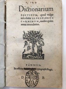Édition publiée par Estienne du dictionnaire poétique d'Hermannus Torrentinus, humaniste né à Zwolle en Belgique au milieu du XVe siècle et frère de la Vie commune.