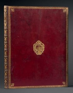 Reliure de l'époque. Maroquin rouge, décor doré, armes de la Ville de Paris au centre des plats, encadrement d'une roulette avec fleurons aux angles, dos à nerfs orné, tranches dorées.