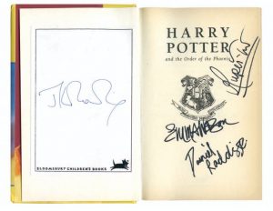 Exemplaire à l'état de neuf, signé par l'auteur et les héros du film: Daniel Radcliffe (Harry Potter), Emma Watson (Hermione Granger) et Rupert Grint (Ron Weasley).