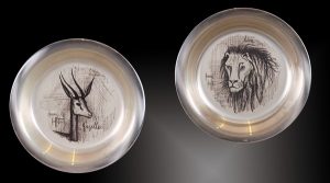 Eaux-fortes gravées sur argent. Ensemble de 5 assiettes en argent massif 1er titre éditées par Le Médailler, Paris. Dans les cadres de bois et velours brun foncé d’origine. Diamètre des assiettes: 20 cm. Chacune porte la signature «Bernard Buffet» et le nom de l’animal représenté, et, au dos, «Le Médailler, Paris. Gravée à l’eau-forte sur argent sterling 1er titre». Ensemble en belle condition.