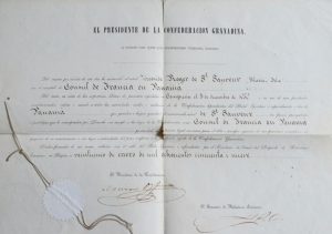 Rare brevet de la confédération grenadine [États-Unis de Colombie qui eut une existence éphémère de 1857 à 1863], autorisant le vicomte Roger de Saint-Sauveur à exercer ses fonctions de consul de France à Panama.