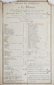 Tarifs des vins fins de Bourgogne (Chambertin, Volnay, Pommard, Nuits, etc.), des Côtes du Rhône (Hermitage, Côte-Rôtie, etc.), de Bordeaux (Lafitte, Château-Margaux, Haut-Brion, etc.), Champagnes et vins blancs, " vins de dessert ", " Bordeaux bon ordinaire " en barrique, " Macon vieux " avec reprise de la bouteille en consigne, eaux de vie, etc. Ainsi que quelques chocolats fins.