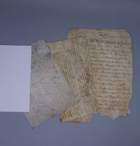 - 23 juin 1683 - Document manuscrit sur vélin, 24 x 17 cm. Extrait des registres du Parlement de Bretagne concernant le procès entre Pierre Chertemps de Jeuil (?), baron de Charon, seigneur de Preaux et de Saint Morice, conseiller du Roi et intendant de la marine, et prévenu en la cour du dit Parlement, et appelant d'une sentance rendue par le sénéchal de Saintes, contre Jean Joubeille et Charlotte Gautier. La Cour tient le procès pour conclu et donne ordre aux parties de produire leurs griefs dans le délai fixé par l'ordonnance. Signatures.