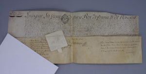 LETTRE DE RATIFICATION. ACHAT D'UNE TERRE SITUÉE A SAMANS (?). Dombes. Manuscrit sur parchemin 26 x 47 cm. Sceau sous papier pendant, signatures.