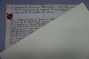 MARQUIS DE MIREMONT D'AUBUSSON. ESTABLY PAR LE ROY EN LA PROVINCE DE PERIGORD ET SUBDELEGUÉ DE NOS SEIGNEURS LES MARECHAUX DE FRANCE. Château de Miremont le 21 juillet 1686. Document manuscrit sur un feuillet papier 17,5 x 25 cm, signatures et cachet de cire rouge. L. A. S. de Monseigneur Bordes.