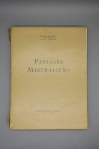MAURRAS (Charles) - DREVET (Joanny). PAYSAGES MISTRALIENS. GRENOBLE, DIDIER & RICHARD, 1944. Un volume, grand in-4, de (16) ff. de texte et 20 eaux-fortes dans leurs chemises illustrées des dessins. Couverture rempliée, imprimée et étui (accidenté).