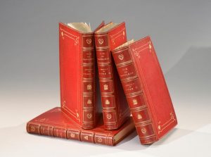 ARNAULT (Antoine - Vincent). VIE POLITIQUE ET MILITAIRE DE NAPOLÉON. BRUXELLES, ARNOLD LACROSSE, 1825. Quatre volumes, in-8, pleines reliures de l'époque en maroquin rouge. Dos à 5 nerfs cloisonnés, fleuronnés et dorés portant les titres dorés. Encadrements dorés sur les plats renferment les insignes du Ier Empire : l'aigle, l'abeille, le N cerclé de lauriers, filet doré sur les coupes, large dentelle intérieure dorée, têtes dorées.