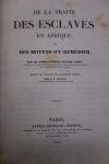 BUXTON (Sir Thomas Fowell). DE LA TRAITE DES ESCLAVES EN AFRIQUE, ET DES MOYENS D'Y REMÉDIER. Traduit de l'Anglais sur la seconde édition, par J. J. Pacaud. PARIS, ARTHUS BERTRAND, 1840. Un volume, in-8, de XXXVI pp., 650 pp., demi-reliure à coins de l'époque en basane havane. Dos à 4 nerfs décoré et doré, filets dorés sur les plats, tranches jaspées. Rousseurs, 3 coins émoussés, petit manque sur le coin inférieur du premier plat.