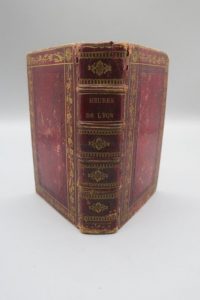 [LYON]. HEURES A L'USAGE DU DIOCÈSE DE LYON. A LYON, CHEZ BOHAIRE, s. d. (XIXe siècle). Un volume, in-12, de 610 pp., pleine reliure de l'époque en basane rouge. Dos à 4 nerfs orné et doré portant le titre doré, dentelle à froid et dorée sur les plats, roulette dorée sur les coupes. Intérieur doublé de tissu moiré vert avec encadrement doré des contre-plats, tranches dorées. Reliure légèrement frottée avec de faibles usures aux coins, galeries de vers sur les mors.