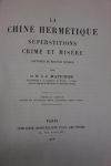MATIGNON (J. J.). LA CHINE HERMÉTIQUE. Superstitions, crime et misère (Souvenirs de biologie sociale). PARIS, LIBRAIRIE ORIENTALISTE PAUL GEUTHNER, 1936. Un colume, in-8, de XX pp., 397 pp., (2) ff., demi-reliure en veau havane . Dos à 5 nerfs orné et doré portant deux pièces de peau pour le titre, une verte, l'autre rouge, couverture et dos conservés. Bel exemplaire.