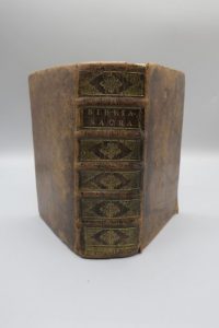 BIBLE LYONNAISE ANCIENNE. BIBLIA AD VETUSTISSIMA. Exemplaria nunc recens castigata, Romæ que reuisa... LUGDUNI, APUD GULIELMUN ROVILLIUM, 1573. Un fort volume, in-8, de (7) ff., 1214 pp., (48) ff., pleine reliure ancienne en basane brune. Dos à 5 nerfs cloisonné, fleuronné et doré portant le titre doré. Première garde manquante, salissures sur plusieurs feuillets, essentiellement dans les marges, pertes de papier pp. 255-256 (sans perte de texte), pp. 463-464 (avec perte conséquente de texte), pp. 993 -994 (avec perte de texte).