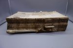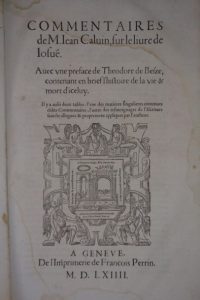 Genese est mis à part, les autres quatre livres sont disposés en forme d'harmonie. EST RELIÉ À LA SUITE COMMENTAIRES DE M. JEAN CALVIN SUR LE LIVRE DE JOSUÉ. Avec une préface de Théodore de Besze, contenant en brief l'histoire de la vie et mort d'iceluy; il y a aussi deux tables, l'une des matières singulières, l'autre des tesmoignages de l'Ecriture saincte alleguez et proprement appliquez par l'auteur. GENÈVE, FRANÇOIS ESTIENNE, 1564 - GENEVE FRANÇOIS PERRIN, 1564. Un volume, petit in-folio, de (8) ff., 716 pp., (13) ff., (1) f. bl., (18) ff., 104 pp., pleine reliure de l'époque en vélin rigide, dos à 6 nerfs, tranches jaspées. Le premier plat de la reliure est manquant ainsi que le dos, le second plat subsiste entièrement détaché. Manques importants sur les 8 premiers feuillets du volume, dont le titre, avec salissures, le bois gravé du titre est quasiment intact, quelques traces de mouillures claires éparses dans l'ouvrage affectant essentiellement les marges.